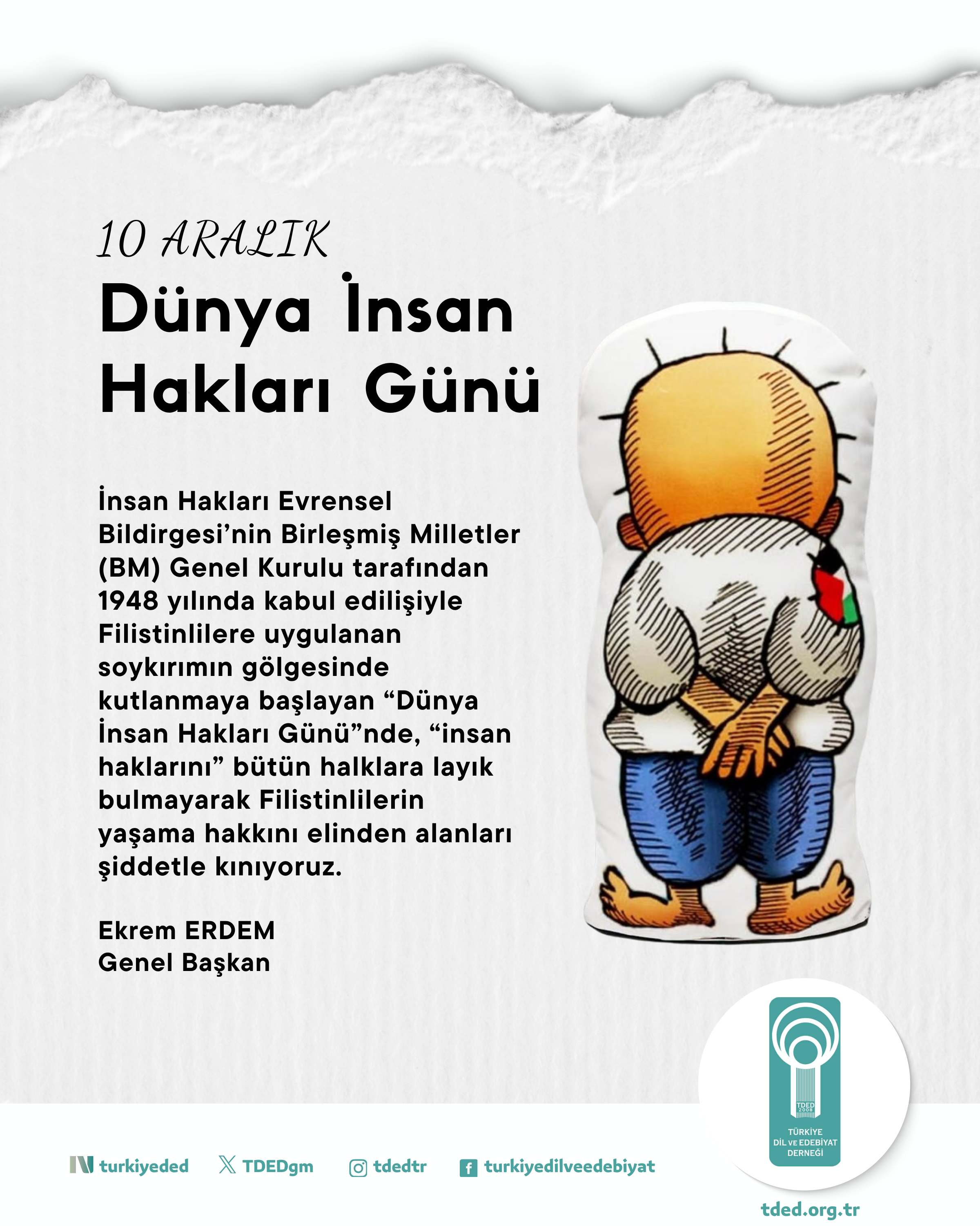 10/12/2025İnsan Hakları Evrensel Bildirgesi’nin Birleşmiş Milletler (BM) Genel Kurulu tarafından 1948 yılında kabul edilişiyle Filistinlilere uygulanan soykırımın gölgesinde kutlanmaya başlayan “Dünya İnsan Hakları Günü”nde, “insan haklarını” bütün halklara layık bulmayarak Filistinlilerin yaşama hakkını elinden alanları şiddetle kınıyoruz.