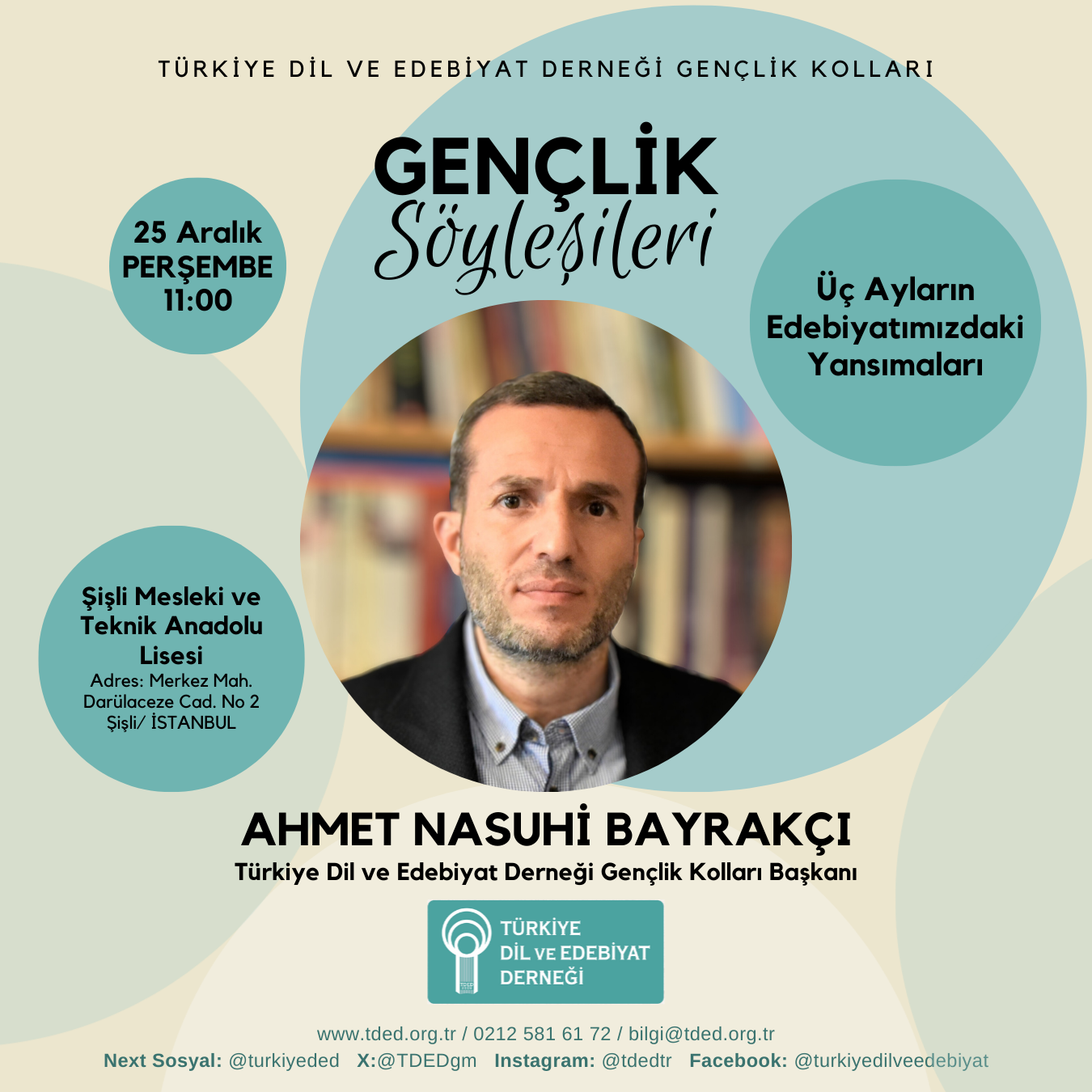 Türkiye Dil ve Edebiyat Derneği (TDED) Gençlik Kolları’nın düzenlediği “Gençlik Söyleşileri” kapsamında TDED Gençlik Kolları Başkanı Ahmet Nasuhi Bayrakçı, “Üç Ayların Edebiyatımızdaki Yansımaları” başlıklı bir söyleşi yapacak. Program, 25 Aralık Perşembe günü saat 11.00’de Şişli Mesleki ve Teknik Anadolu Lisesi Konferans Salonu’nda gerçekleşecek.