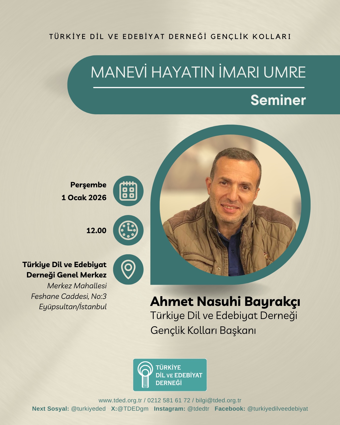 Türkiye Dil ve Edebiyat Derneği (TDED) Gençlik Kolları’nın düzenlediği “Gençlik Söyleşileri” kapsamında TDED Gençlik Kolları Başkanı Ahmet Nasuhi Bayrakçı, “Manevi Hayatın İmarı Umre” başlıklı bir seminer verecek. Program, 1 Ocak Perşembe günü saat 12.00’de dernek genel merkezindeki Ahmed Yesevî Konferans Salonu’nda gerçekleşecek.