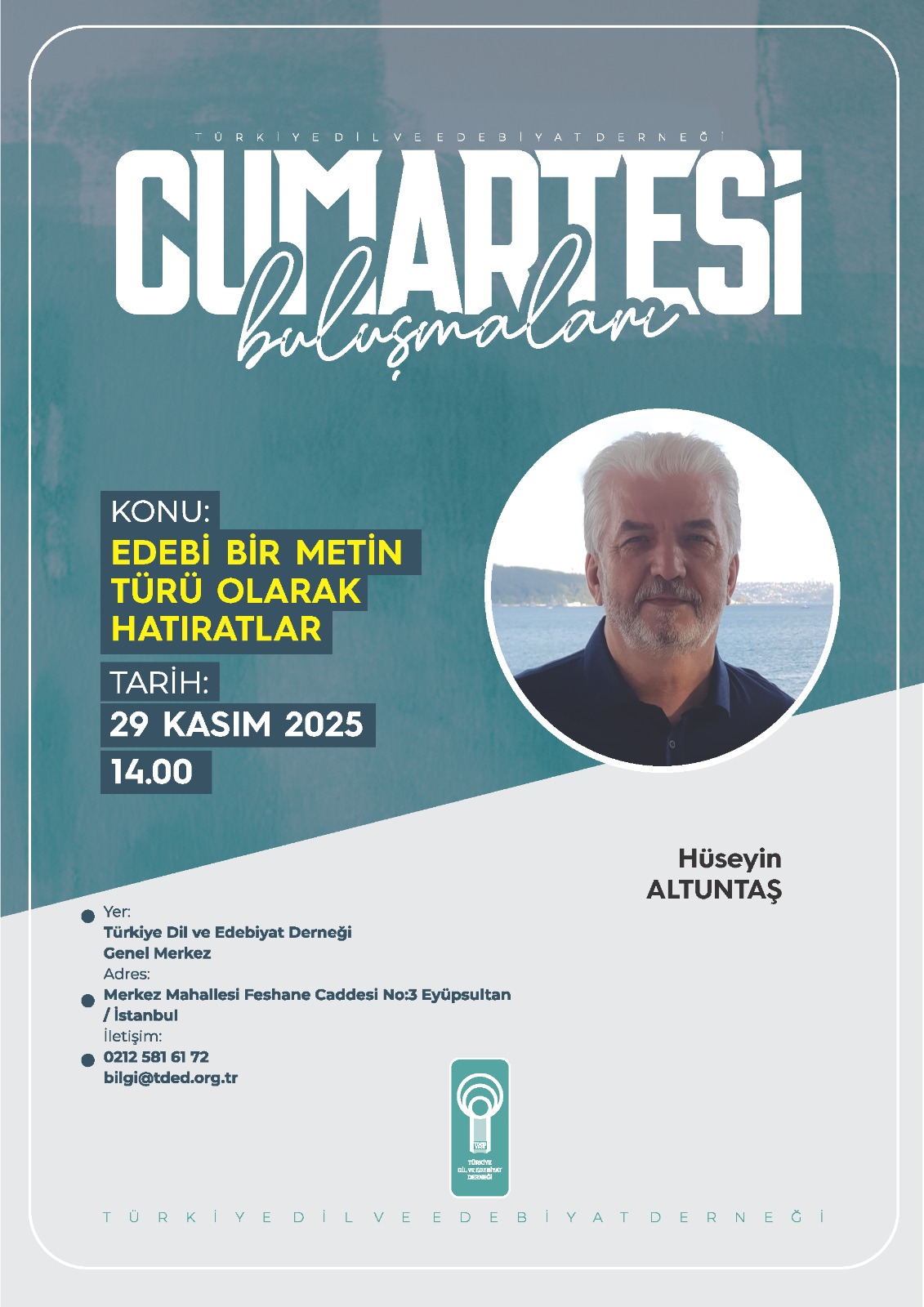 Türkiye Dil ve Edebiyat Derneği’nin (TDED) gelenekselleşen haftalık söyleşi programı “Cumartesi Buluşmaları”nda ayın dördüncü konuşmacısı Hüseyin Altuntaş, “Edebi Bir Metin Türü Olarak Hatıratlar” başlıklı bir konuşma yapacak.