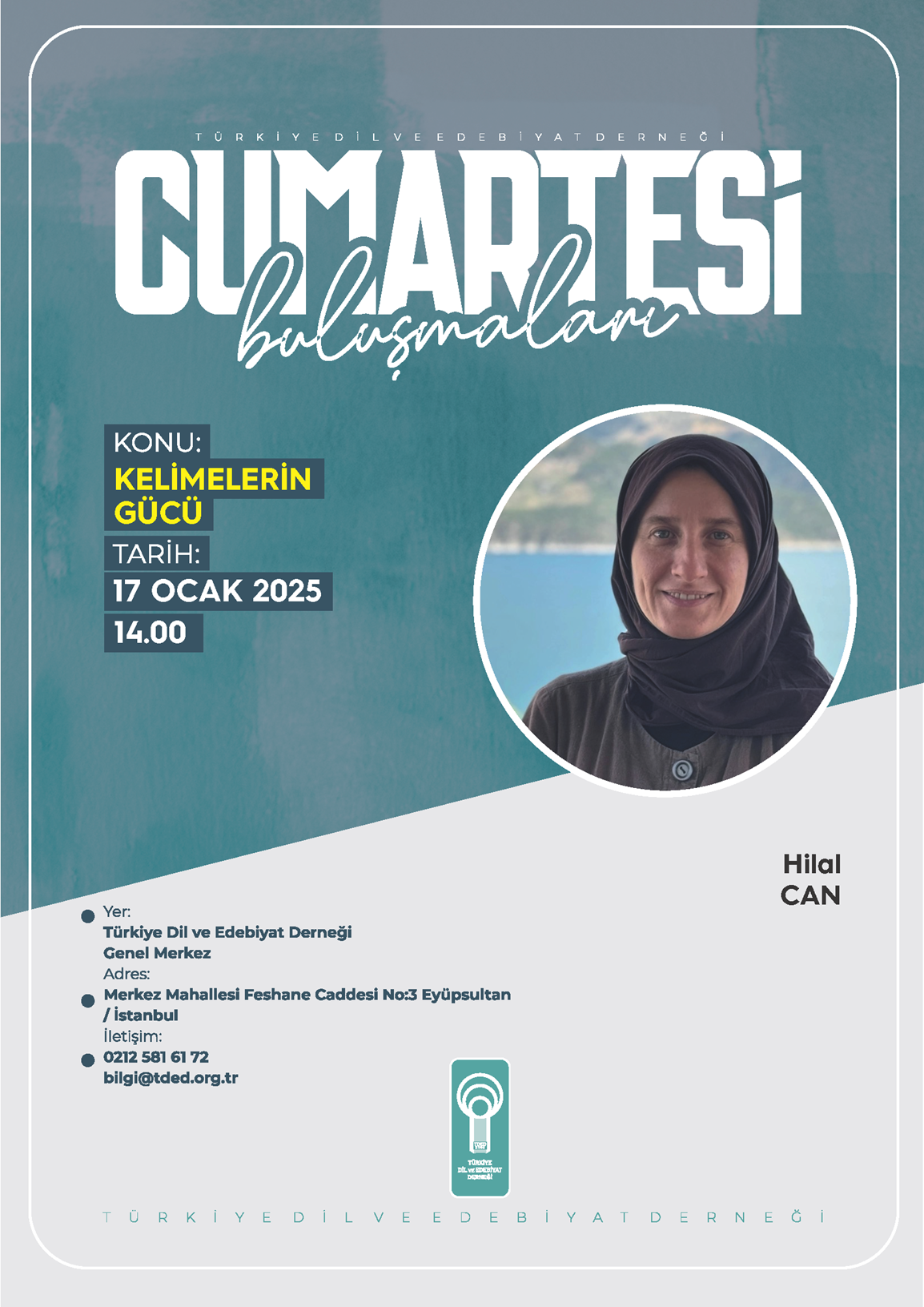Türkiye Dil ve Edebiyat Derneği’nin (TDED) kurulduğu günden bu yana aralıksız sürdürdüğü haftalık söyleşi programı “Cumartesi Buluşmaları”nda ayın üçüncü konuşmacısı Klinik Psikolog Hilal Can, “Kelimelerin Gücü” başlıklı bir konuşma yapacak.