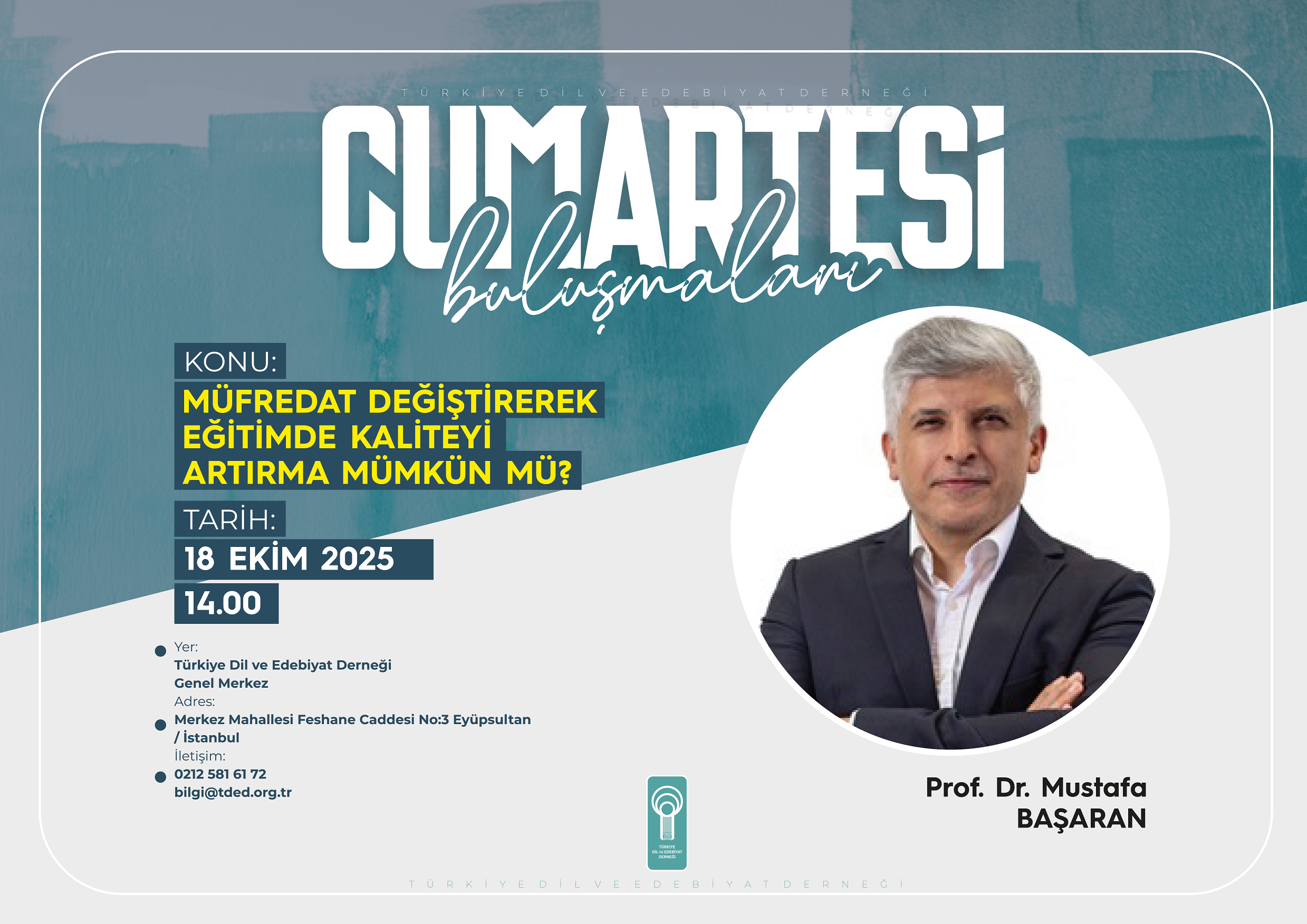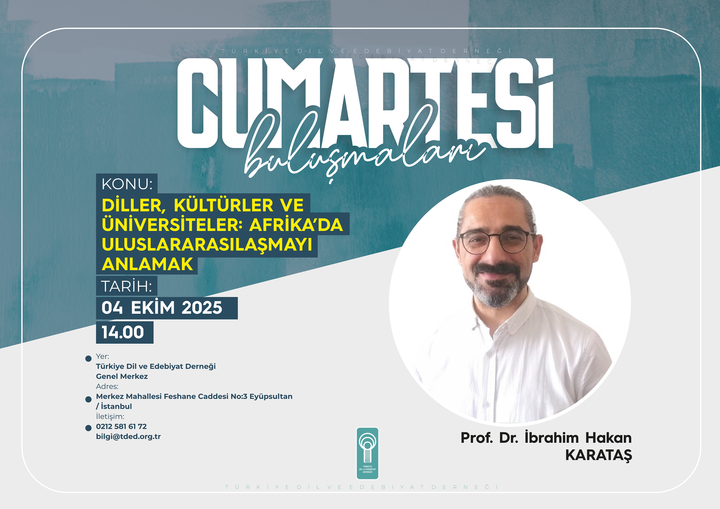 Türkiye Dil ve Edebiyat Derneği’nin (TDED) gelenekselleşen haftalık söyleşi programı “Cumartesi Buluşmaları” başlıyor. Dil, edebiyat ve kültüre dair önemli konuları masaya yatıran söyleşilerin Ekim programında; Prof. Dr. İbrahim Hakan Karataş, Prof. Dr. Suat Ungan, Prof. Dr. Mustafa Başaran, Keziban Soylu konuşmacı olarak yer alacak.