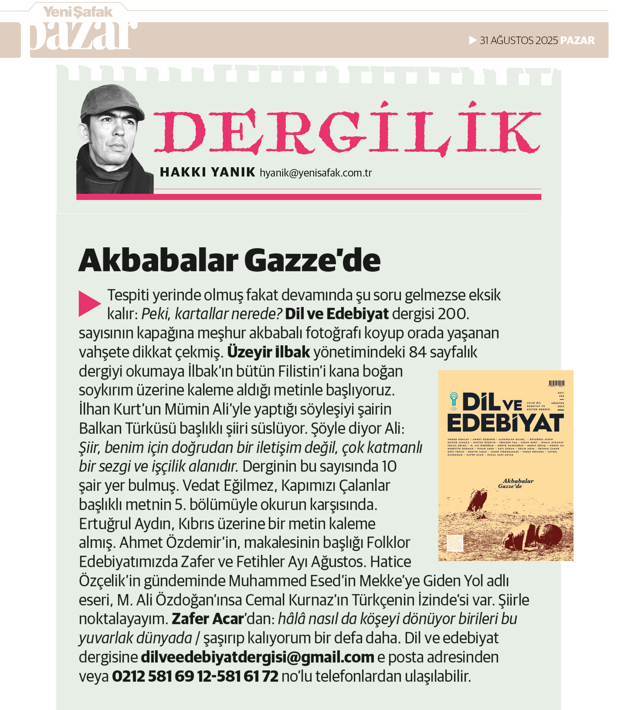 Tespiti yerinde olmuş fakat devamında şu soru gelmezse eksik kalır: Peki, kartallar nerede? Dil ve Edebiyat dergisi 200. sayısının kapağına meşhur akbabalı fotoğrafı koyup orada yaşanan vahşete dikkat çekmiş. Üzeyir İlbak yönetimindeki 84 sayfalık dergiyi okumaya İlbak’ın bütün Filistin’i kana boğan soykırım üzerine kaleme aldığı metinle başlıyoruz. İlhan Kurt’un Mümin Ali’yle yaptığı söyleşiyi şairin Balkan Türküsü başlıklı şiiri süslüyor. Şöyle diyor Ali: Şiir, benim için doğrudan bir iletişim değil, çok katmanlı bir sezgi ve işçilik alanıdır. Derginin bu sayısında 10 şair yer bulmuş. Vedat Eğilmez, Kapımızı Çalanlar başlıklı metnin 5. bölümüyle okurun karşısında. Ertuğrul Aydın, Kıbrıs üzerine bir metin kaleme almış. Ahmet Özdemir’in, makalesinin başlığı Folklor Edebiyatımızda Zafer ve Fetihler Ayı Ağustos. Hatice Özçelik’in gündeminde Muhammed Esed’in Mekke’ye Giden Yol adlı eseri, M. Ali Özdoğan’ınsa Cemal Kurnaz’ın Türkçenin İzinde’si var. Şiirle noktalayayım. Zafer Acar’dan: hâlâ nasıl da köşeyi dönüyor birileri bu yuvarlak dünyada / şaşırıp kalıyorum bir defa daha. Dil ve edebiyat dergisine [email protected] e posta adresinden veya 0212 581 69 12-581 61 72 no’lu telefonlardan ulaşılabilir.
