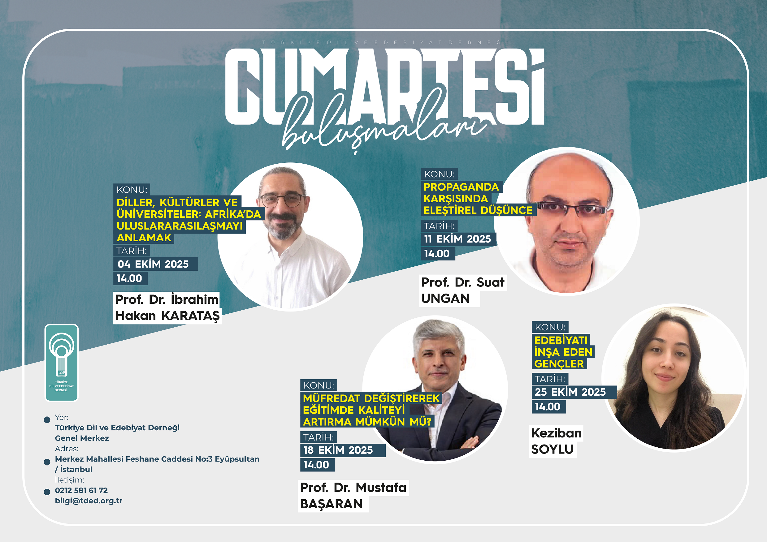 Türkiye Dil ve Edebiyat Derneği’nin (TDED) gelenekselleşen haftalık söyleşi programı “Cumartesi Buluşmaları” başlıyor. Dil, edebiyat ve kültüre dair önemli konuları masaya yatıran söyleşilerin Ekim programında; Prof. Dr. İbrahim Hakan Karataş, Prof. Dr. Suat Ungan, Prof. Dr. Mustafa Başaran, Keziban Soylu konuşmacı olarak yer alacak.
