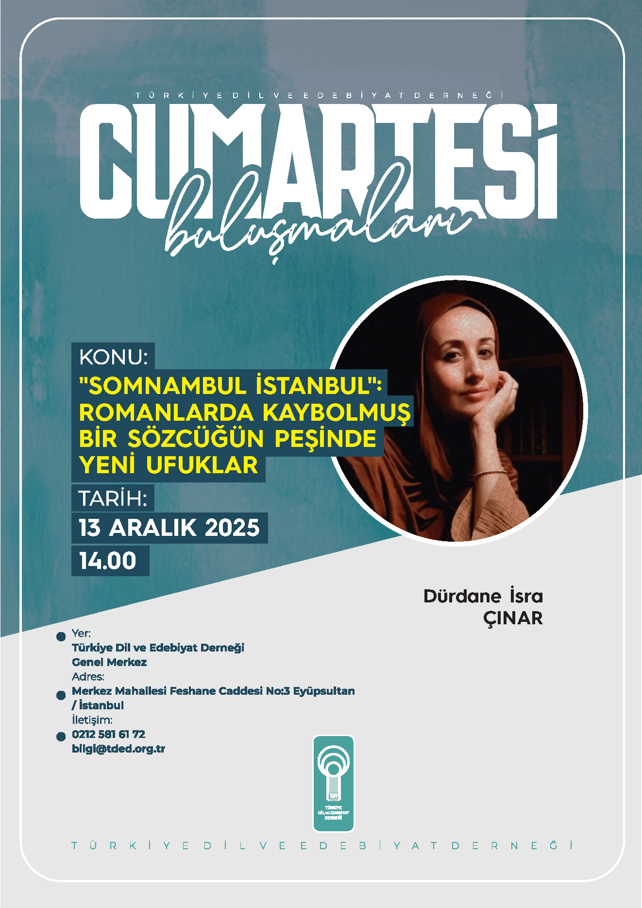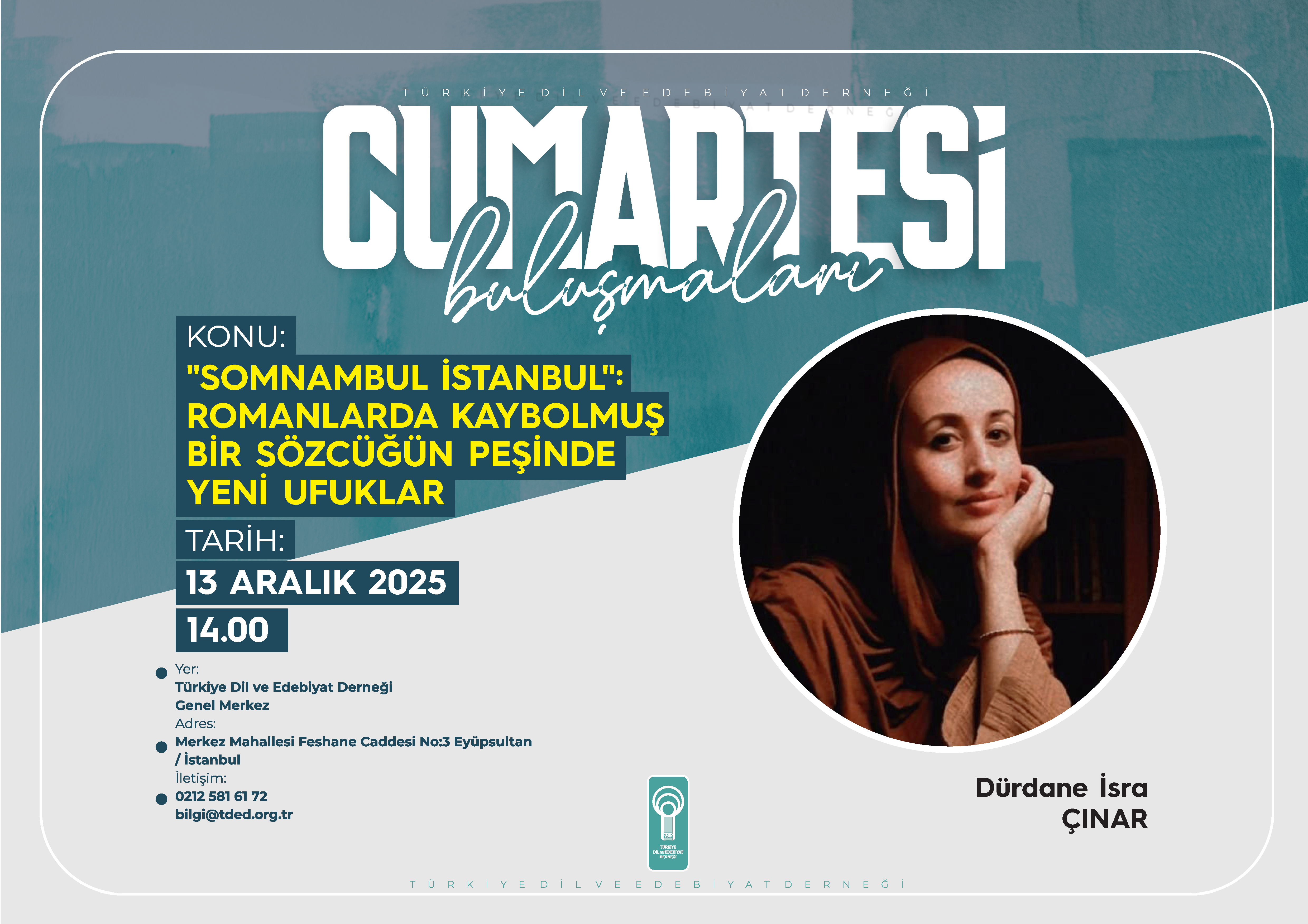 Türkiye Dil ve Edebiyat Derneği’nin (TDED) gelenekselleşen haftalık söyleşi programı “Cumartesi Buluşmaları”nda ayın ikinci konuşmacısı edebiyatçı Dürdane İsra Çınar, “‘Somnambul İstanbul’: Romanlarda Kaybolmuş Bir Sözcüğün Peşinde Yeni Ufuklar” başlıklı bir konuşma yapacak.