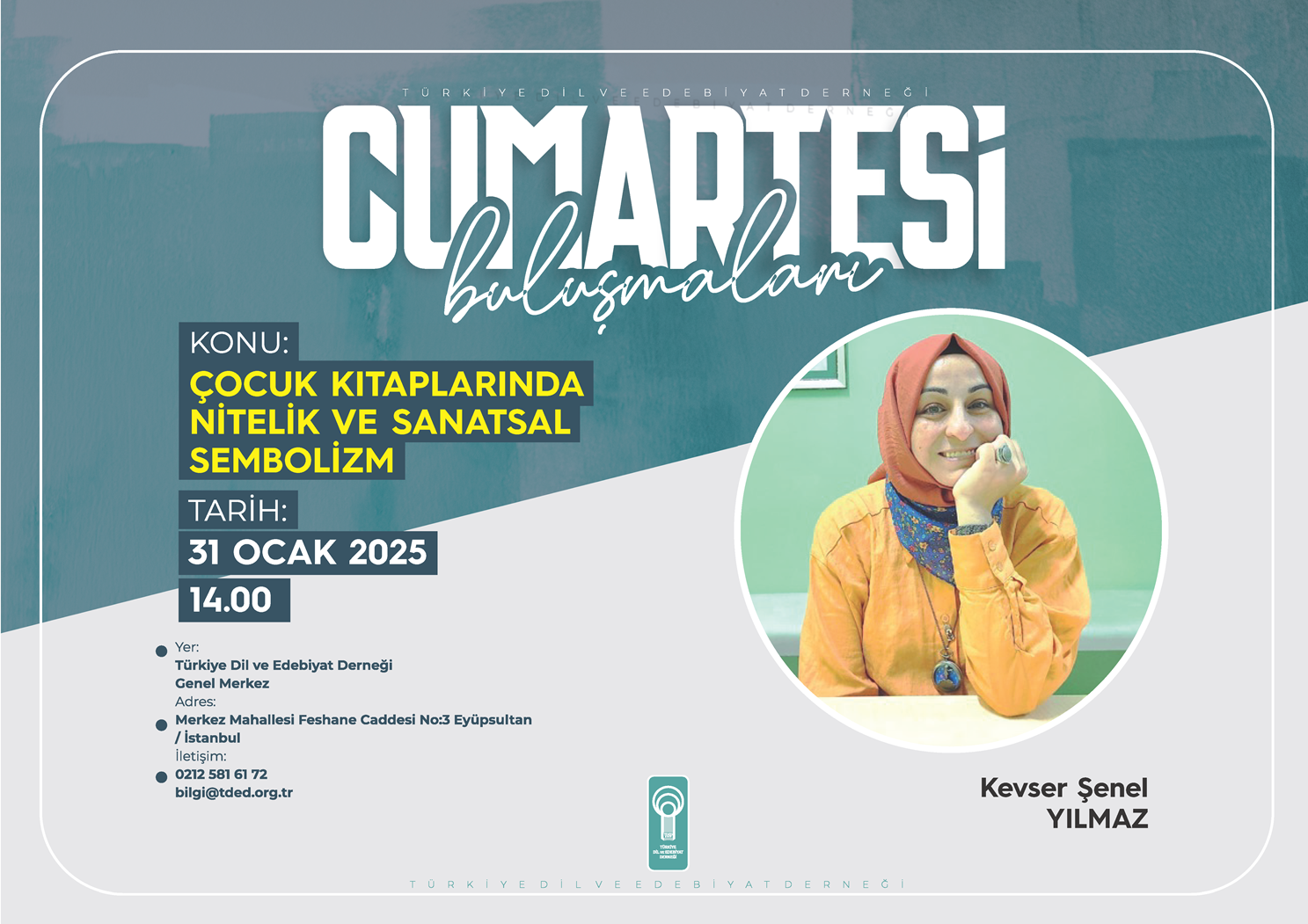 Türkiye Dil ve Edebiyat Derneği’nin (TDED) kurulduğu günden bu yana aralıksız sürdürdüğü haftalık söyleşi programı “Cumartesi Buluşmaları”nda yazar, çocuk kitabı editörü Kevser Şenel Yılmaz, “Çocuk Kitaplarında Nitelik ve Sanatsal Sembolizm” başlıklı bir konuşma yapacak.