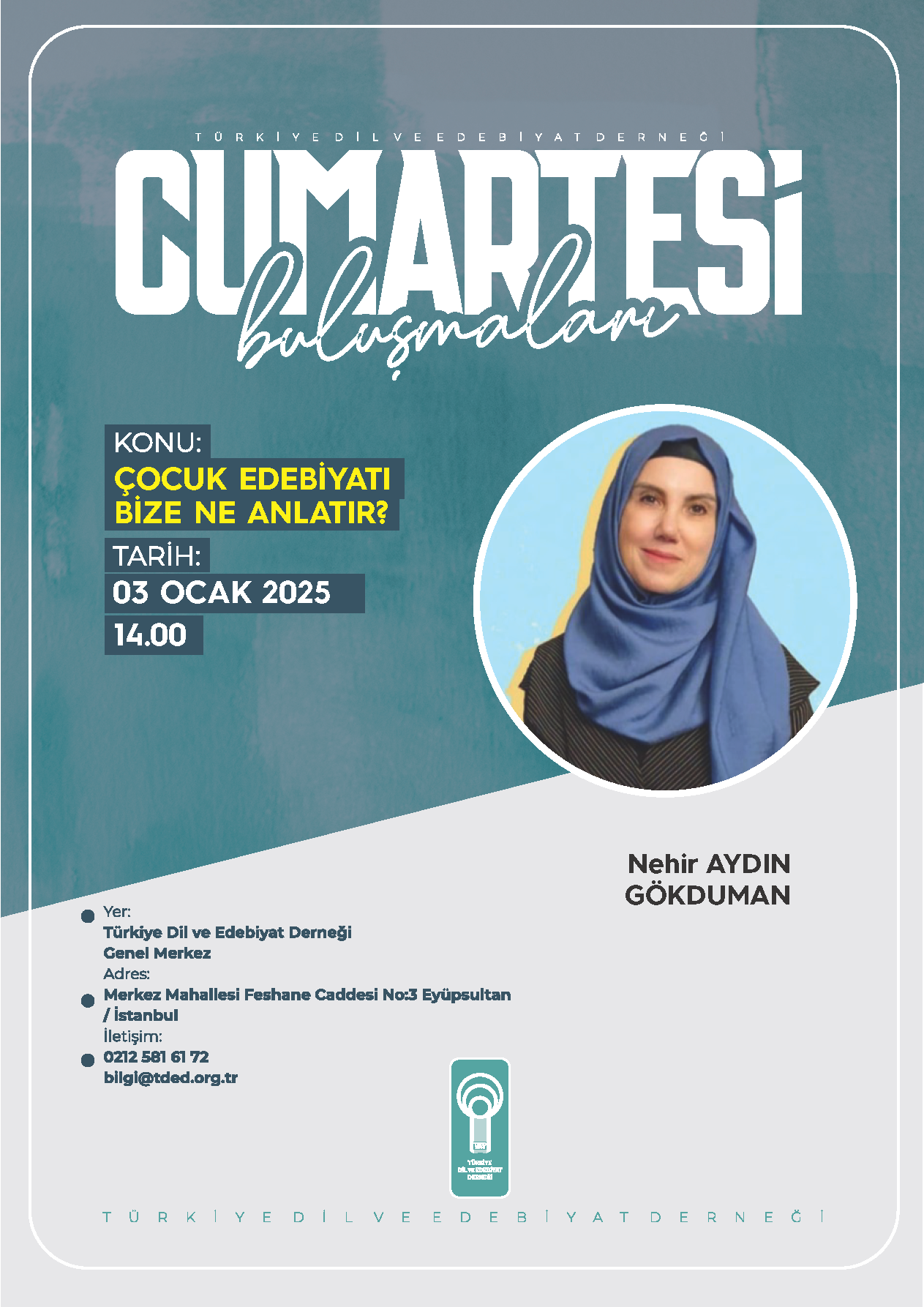 Türkiye Dil ve Edebiyat Derneği’nin (TDED) kurulduğu günden bu yana aralıksız sürdürdüğü haftalık söyleşi programı “Cumartesi Buluşmaları”nda ayın ilk konuşmacısı yazar Nehir Aydın Gökduman, “Çocuk Edebiyatı Bize Ne Anlatır?” başlıklı bir konuşma yapacak.