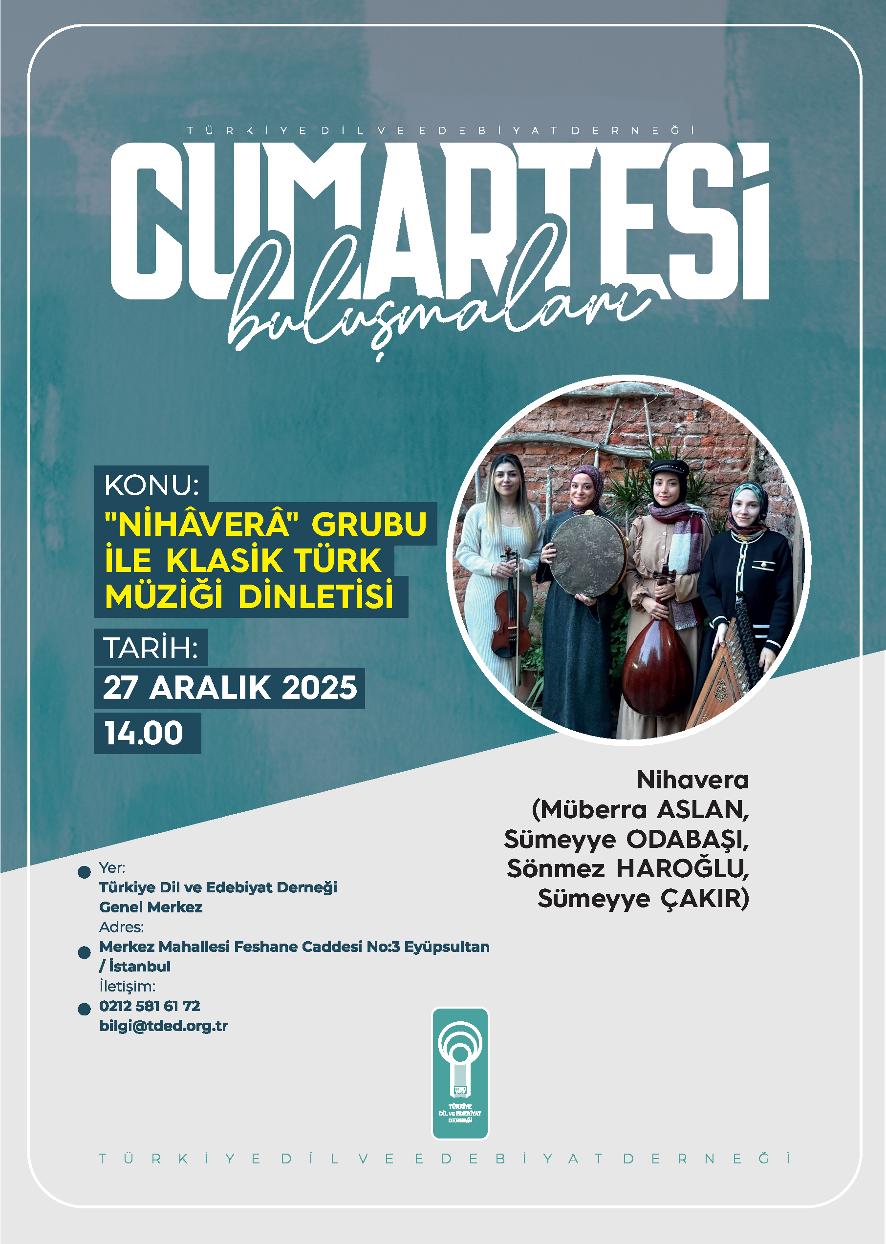 Türkiye Dil ve Edebiyat Derneği’nin (TDED) gelenekselleşen haftalık söyleşi programı “Cumartesi Buluşmaları”nda ayın dördüncü programında Nihavera müzik grubu, “Klasik Türk Müziği Dinletisi” gerçekleştirecek.