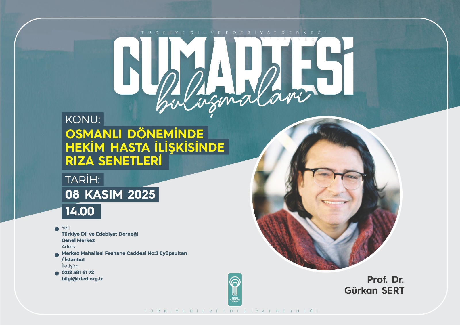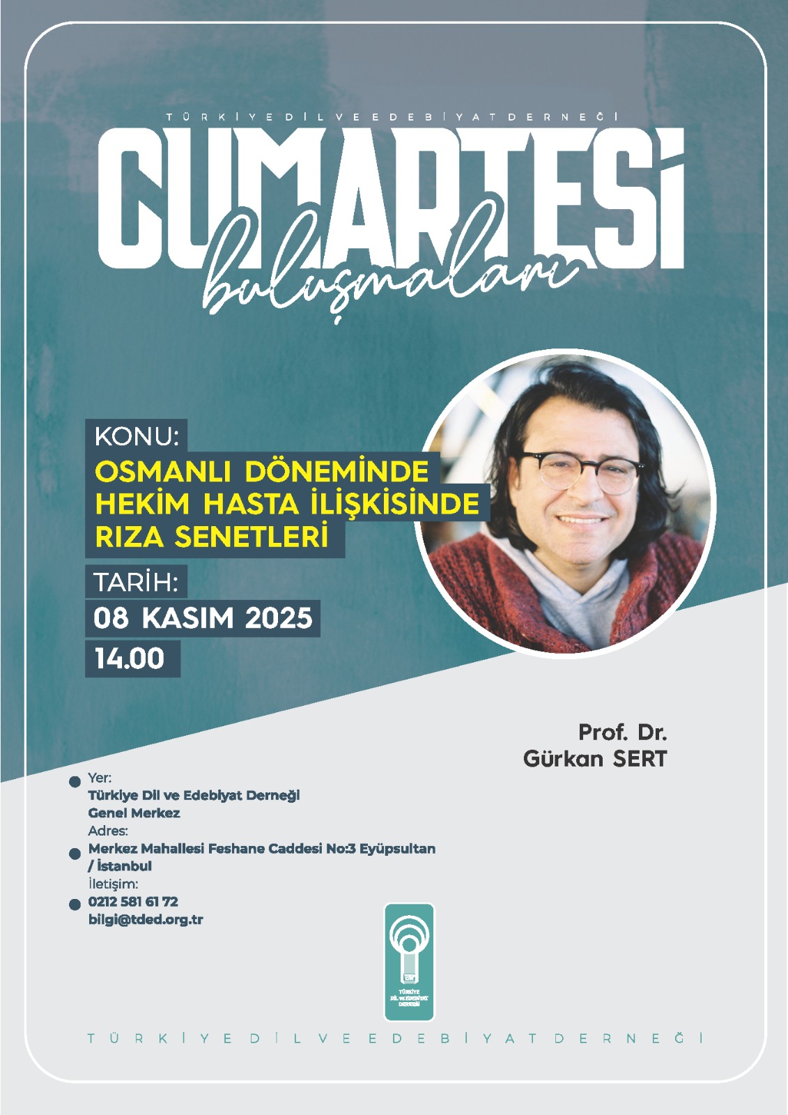 Türkiye Dil ve Edebiyat Derneği’nin (TDED) gelenekselleşen haftalık söyleşi programı “Cumartesi Buluşmaları”nda ayın ilk konuşmacısı Prof. Dr. Gürkan Sert, “Osmanlı Dönemimde Hekim Hasta İlişkisinde Rıza Senetleri” başlıklı bir konuşma yapacak.