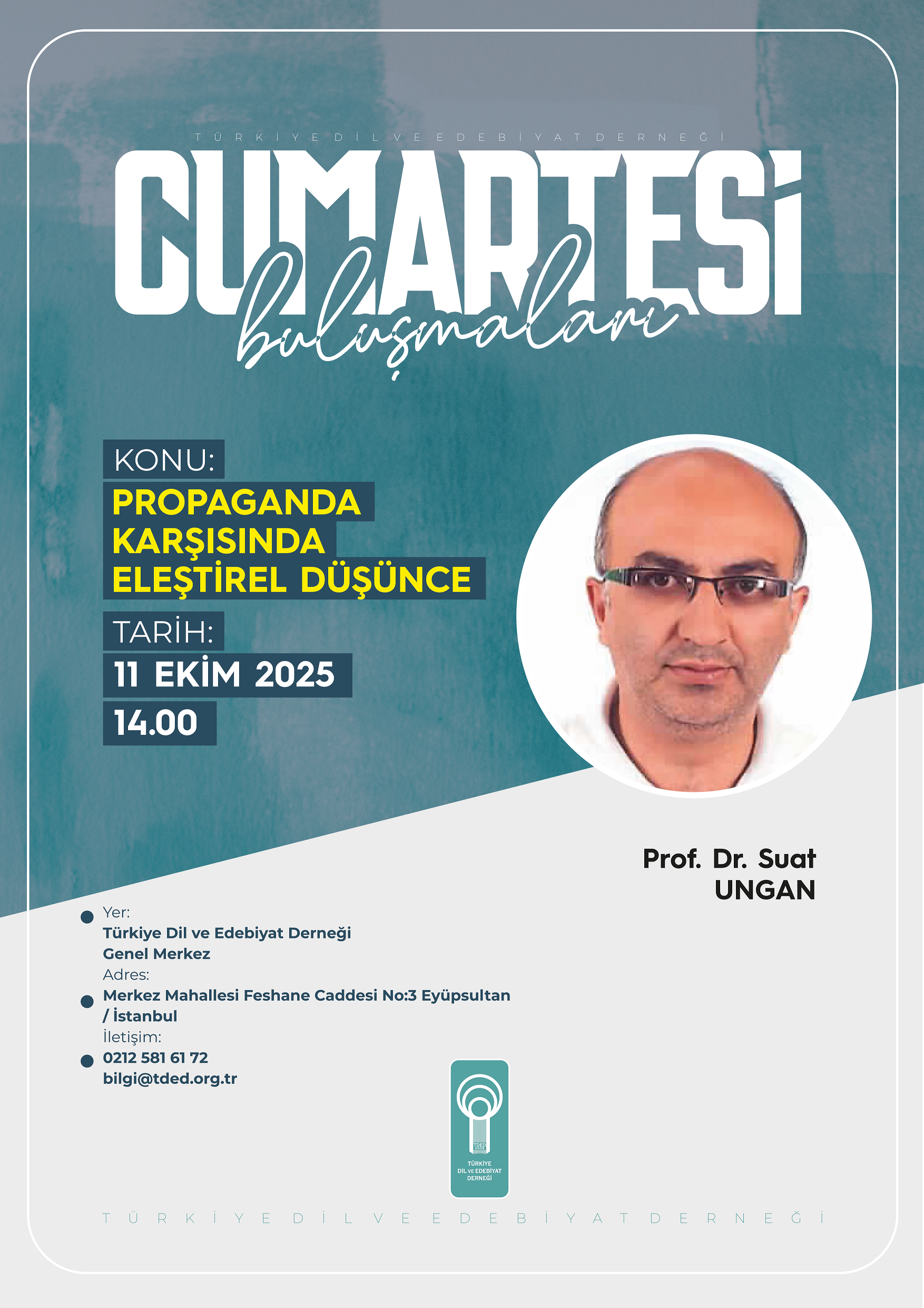 Türkiye Dil ve Edebiyat Derneğinin (TDED) haftalık söyleşi programı “Cumartesi Buluşmaları”nda Prof. Dr. Suat Ungan, “Propaganda Karşısında Eleştirel Düşünce” başlıklı bir konuşma yapacak.