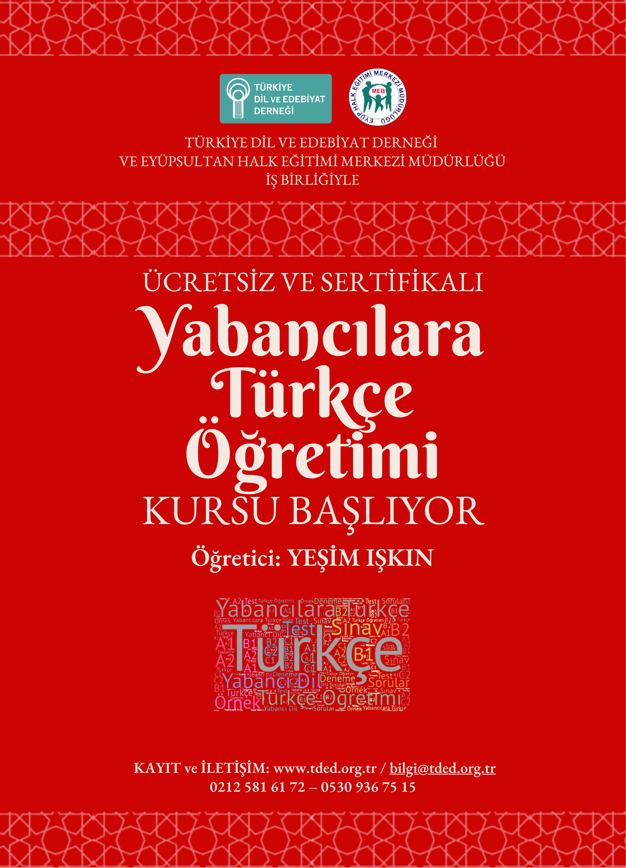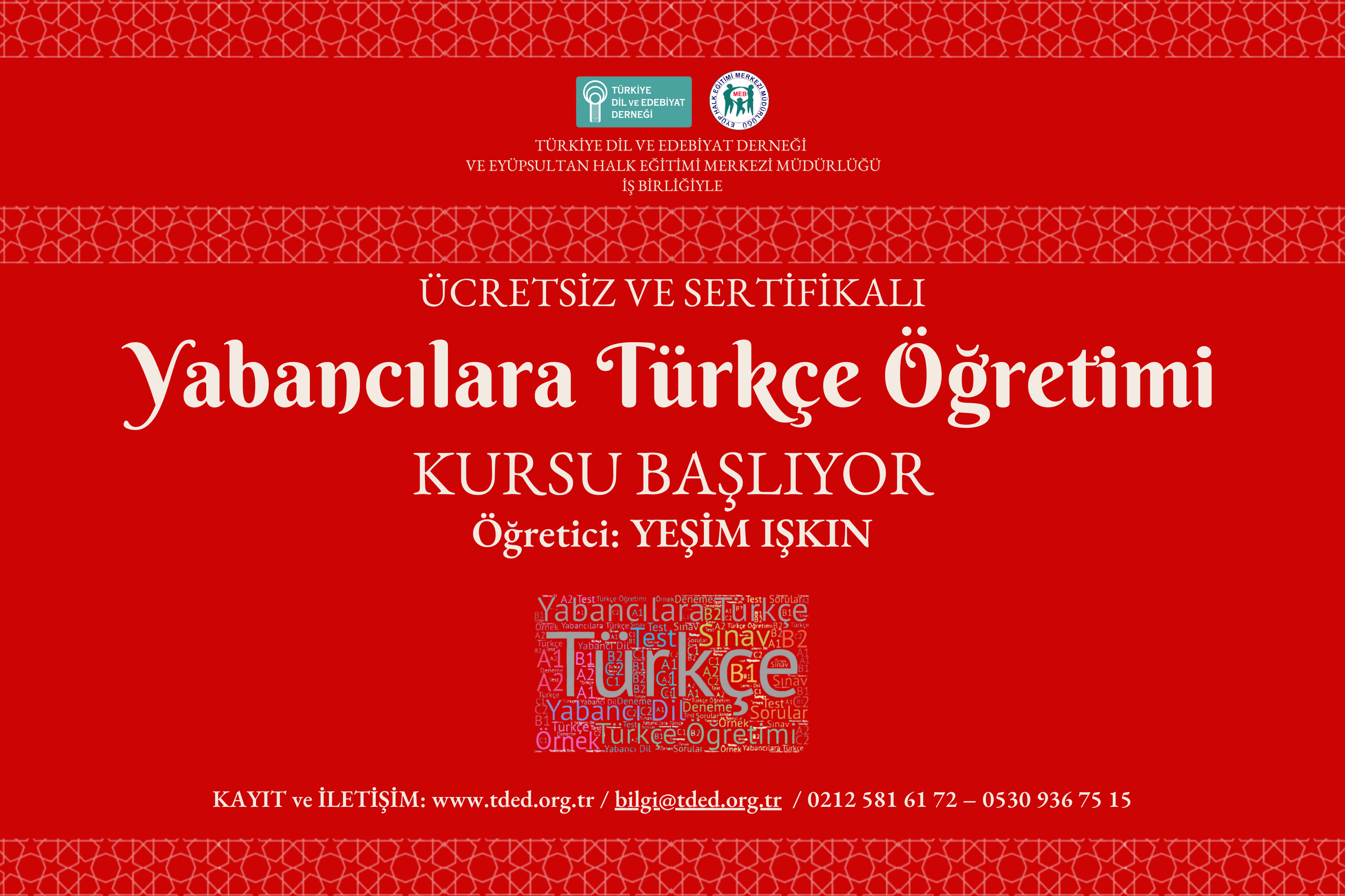Türkiye Dil ve Edebiyat Derneği'nin Eyüpsultan Halk Eğitimi Merkezi Müdürlüğü iş birliği ile verdiği, sertifikalı ve ücretsiz Yabancılara Türkçe Öğretimi kursunun yeni dönemi başlıyor. Yeşim Işkın’ın öğreticiliğini yaptığı kurs, Aralık 2025’te başlayacak ve eğitimler yüz yüze gerçekleştirilecek.