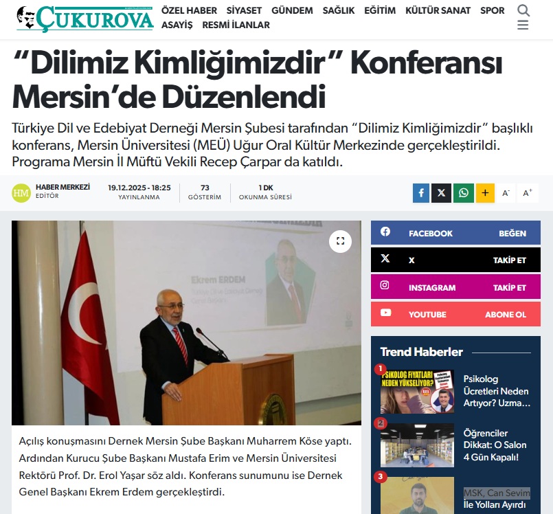 19/12/2025Türkiye Dil ve Edebiyat Derneği Mersin Şubesi tarafından “Dilimiz Kimliğimizdir” başlıklı konferans, Mersin Üniversitesi (MEÜ) Uğur Oral Kültür Merkezinde gerçekleştirildi. Programa Mersin İl Müftü Vekili Recep Çarpar da katıldı.