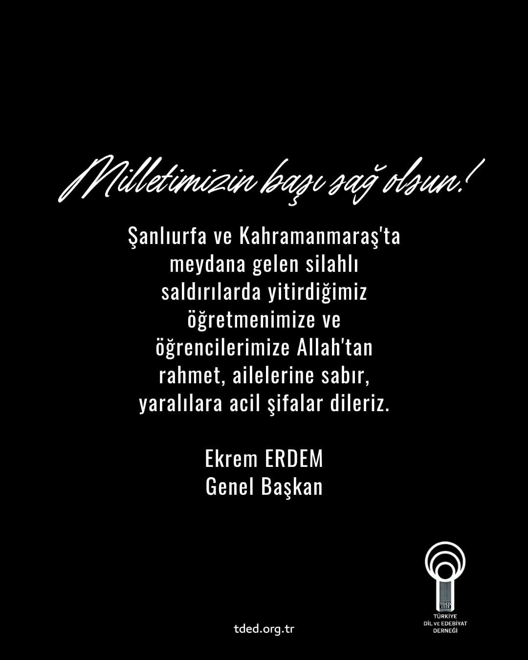 16/04/2026Şanlıurfa ve Kahramanmaraş'ta meydana gelen silahlı saldırılar sebebiyle Türkiye Dil ve Edebiyat Derneği (TDED) Genel Başkanı Ekrem Erdem başsağlığı mesajı yayımladı. Mesajında “Şanlıurfa ve Kahramanmaraş'ta meydana gelen silahlı saldırılarda yitirdiğimiz öğretmenimize ve öğrencilerimize Allah'tan rahmet, ailelerine sabır, yaralılara acil şifalar dileriz.” cümlelerine yer veren Erdem, milletimize bağ sağlığı diledi.