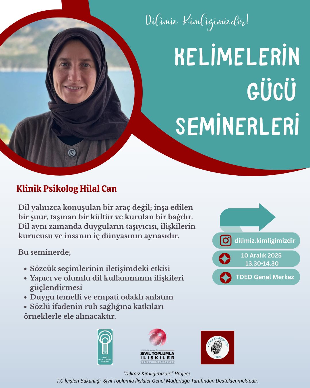 İçişleri Bakanlığı desteğiyle hayata geçirilen projenin yürütücülüğünü Proje Koordinatörü Emine Bayburt'un yaptığı "Dilimiz Kimliğimizdir" projesi kapsamında düzenlenen “Kelimelerin Gücü Seminerleri”, dilin yalnızca iletişim aracı değil; duygularımızı, bağlarımızı ve iç dünyamızı taşıyan güçlü bir yapı olduğunu hatırlatmayı amaçlıyor. Bu kapsamda, ilk olarak Klinik Psikolog Hilal Can ile gerçekleştirilecek seminerde;