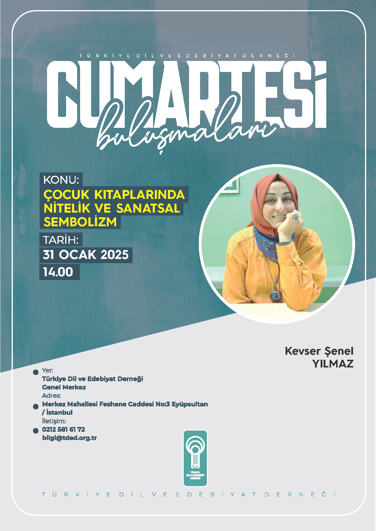 Türkiye Dil ve Edebiyat Derneği’nin (TDED) kurulduğu günden bu yana aralıksız sürdürdüğü haftalık söyleşi programı “Cumartesi Buluşmaları”nda yazar, çocuk kitabı editörü Kevser Şenel Yılmaz, “Çocuk Kitaplarında Nitelik ve Sanatsal Sembolizm” başlıklı bir konuşma yapacak.