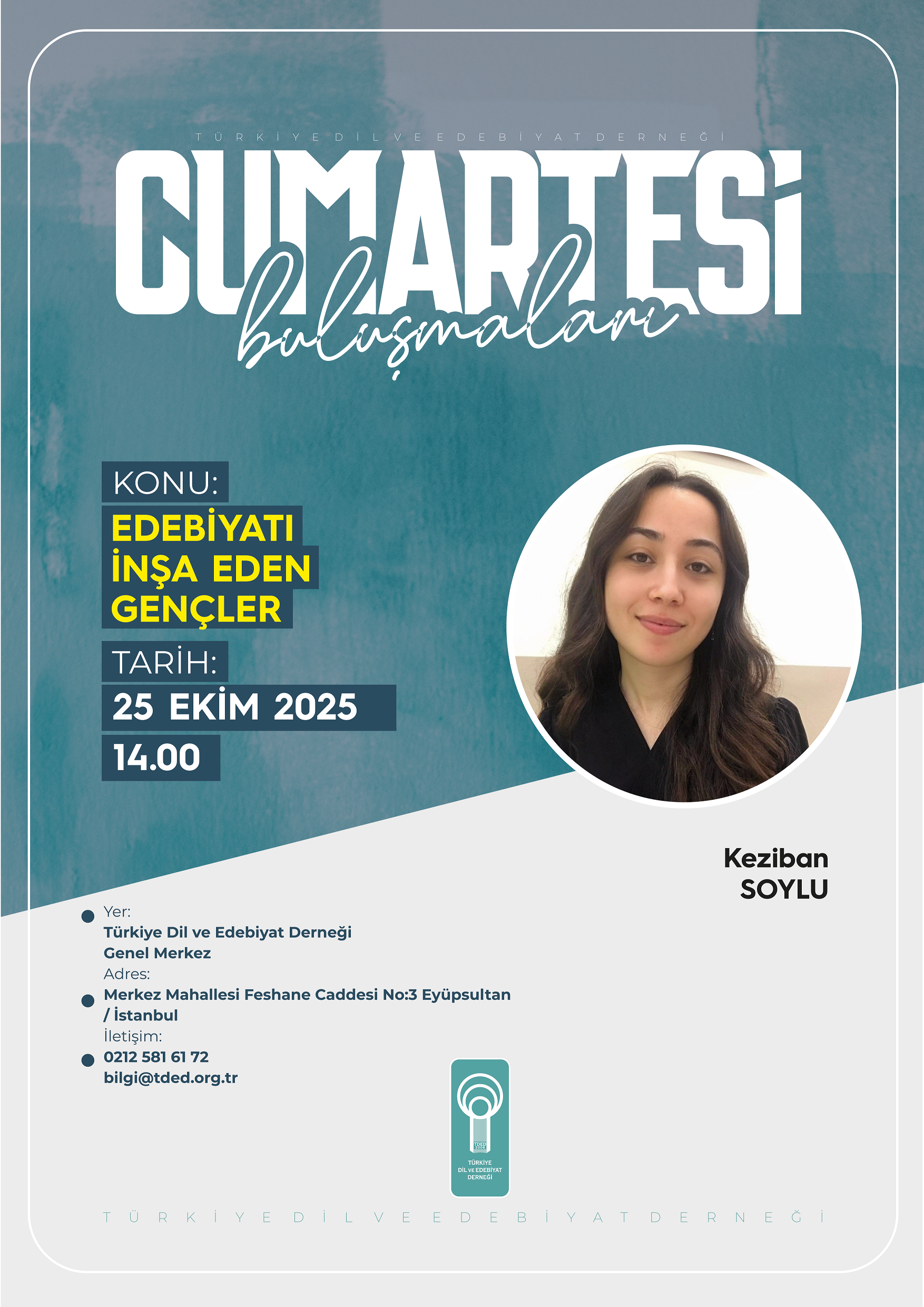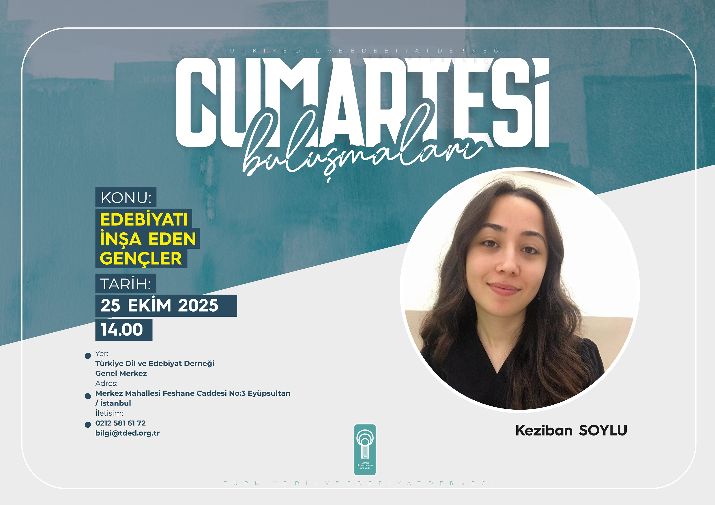 Türkiye Dil ve Edebiyat Derneğinin (TDED) haftalık söyleşi programı “Cumartesi Buluşmaları”nda Olağan Hikâye Yayın Kurulu Üyesi hikâyeci yazar Keziban Soylu, “Edebiyatı İnşa Eden Gençler” başlıklı bir konuşma yapacak.