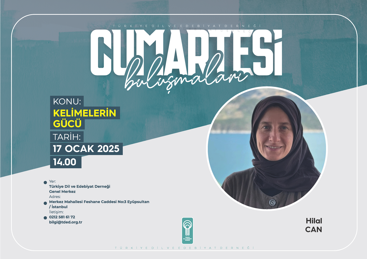 Türkiye Dil ve Edebiyat Derneği’nin (TDED) kurulduğu günden bu yana aralıksız sürdürdüğü haftalık söyleşi programı “Cumartesi Buluşmaları”nda ayın üçüncü konuşmacısı Klinik Psikolog Hilal Can, “Kelimelerin Gücü” başlıklı bir konuşma yapacak.