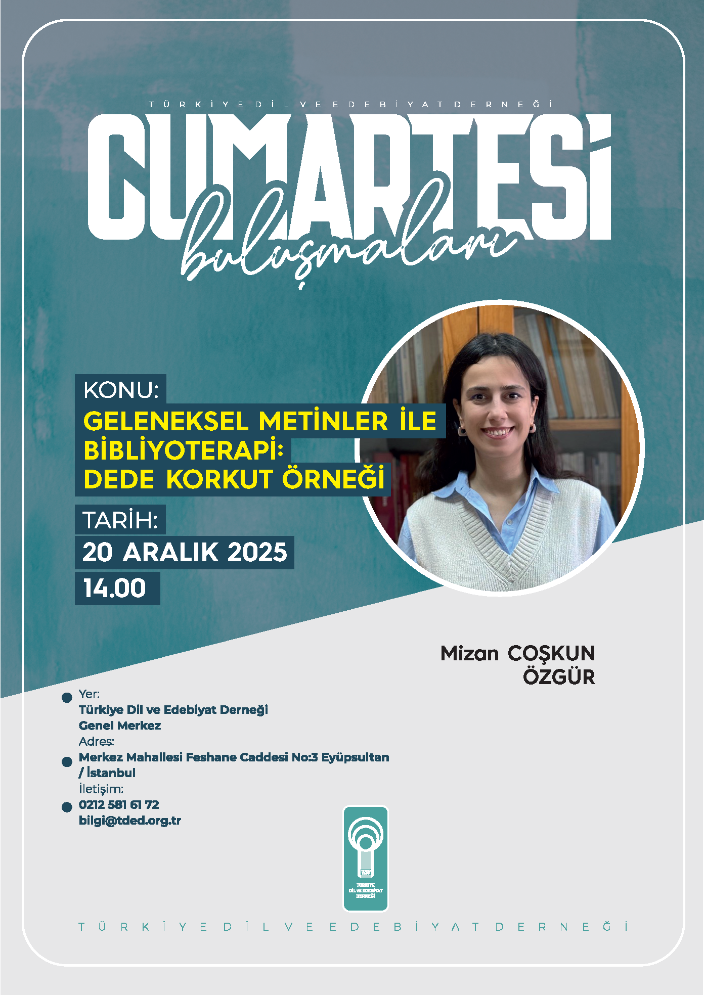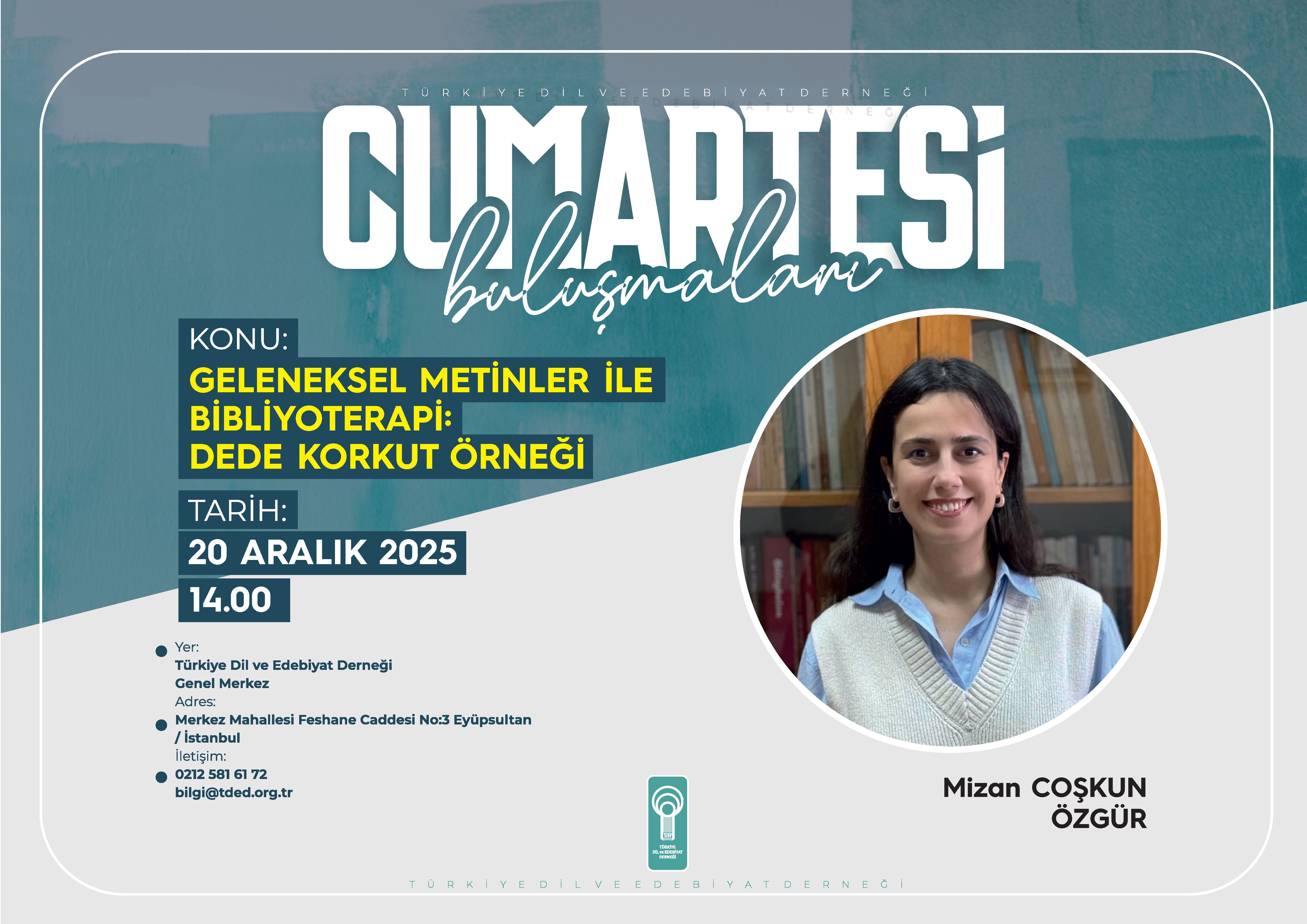 Türkiye Dil ve Edebiyat Derneği’nin (TDED) gelenekselleşen haftalık söyleşi programı “Cumartesi Buluşmaları”nda ayın üçüncü konuşmacısı Mizan Coşkun Özgür, “Geleneksel Metinler ile Bibliyoterapi: Dede Korkut Örneği” başlıklı bir konuşma yapacak.
