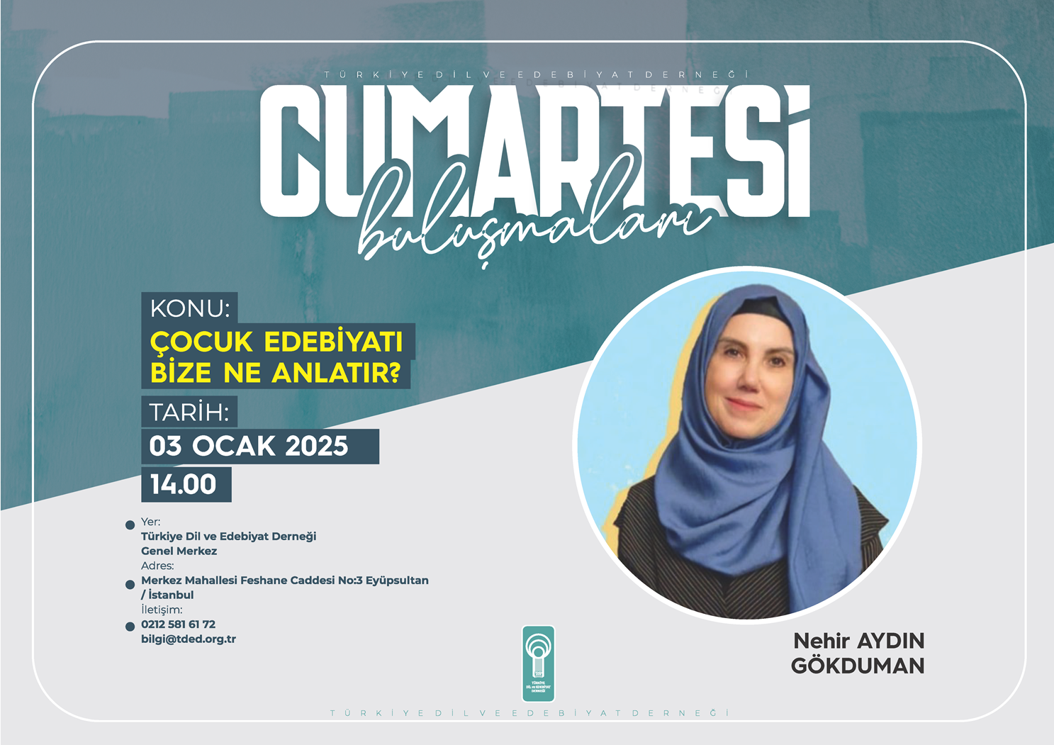 Türkiye Dil ve Edebiyat Derneği’nin (TDED) kurulduğu günden bu yana aralıksız sürdürdüğü haftalık söyleşi programı “Cumartesi Buluşmaları”nda ayın ilk konuşmacısı yazar Nehir Aydın Gökduman, “Çocuk Edebiyatı Bize Ne Anlatır?” başlıklı bir konuşma yapacak.