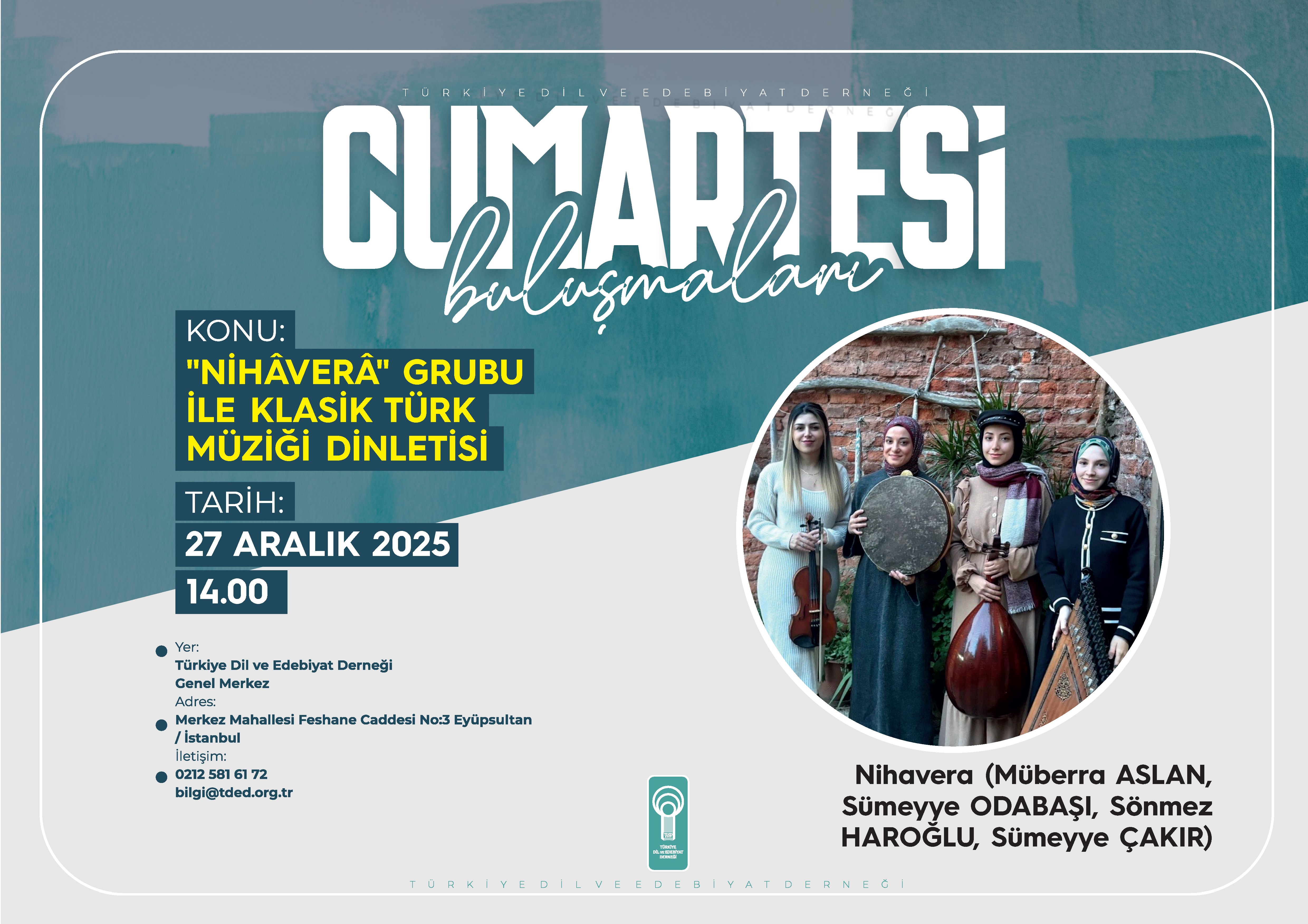 Türkiye Dil ve Edebiyat Derneği’nin (TDED) gelenekselleşen haftalık söyleşi programı “Cumartesi Buluşmaları”nda ayın dördüncü programında Nihavera müzik grubu, “Klasik Türk Müziği Dinletisi” gerçekleştirecek.