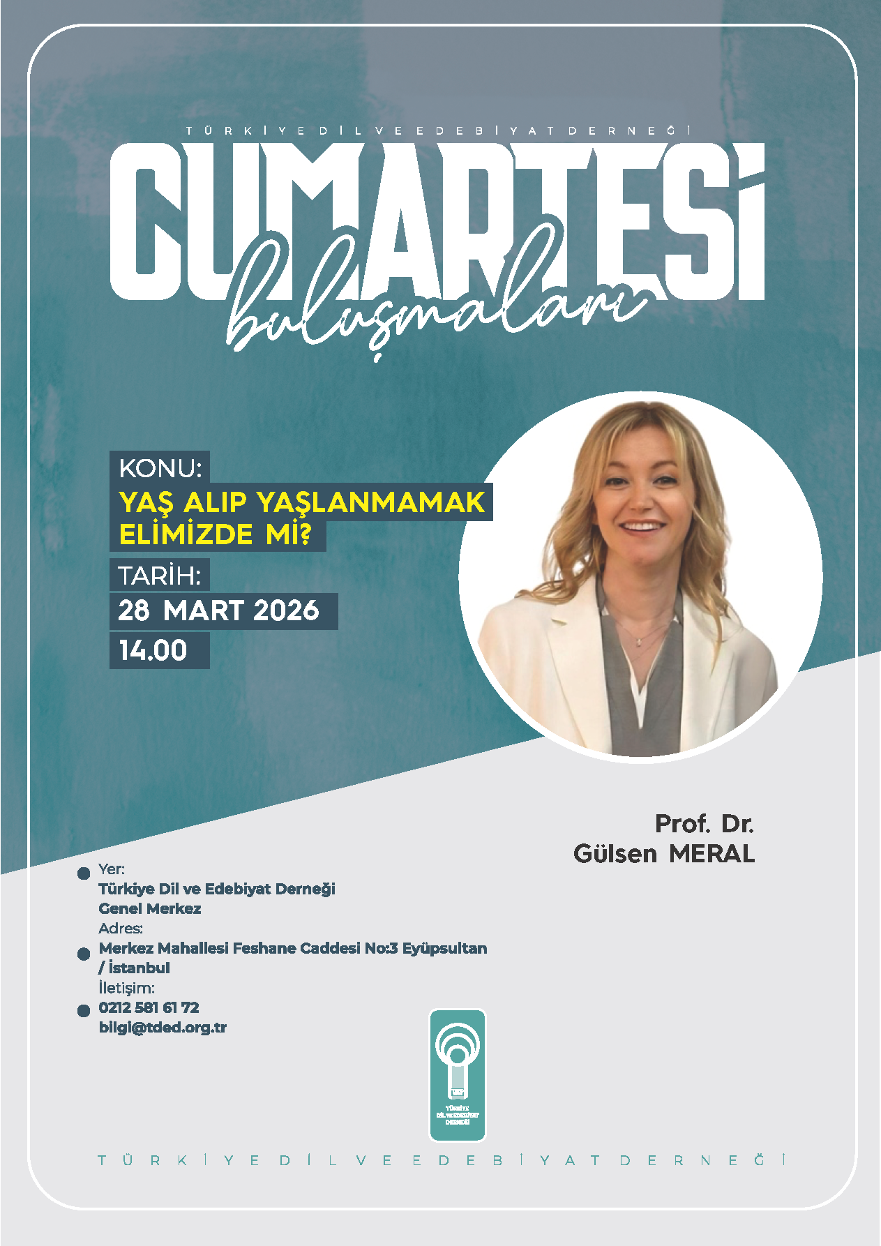 Türkiye Dil ve Edebiyat Derneğinin (TDED) haftalık söyleşi programı “Cumartesi Buluşmaları” Mart programında Epigenetik Koçluk Kurucusu Prof. Dr. Gülsen Meral, “Yaş Alıp Yaşlanmamak Elimizde mi?” başlıklı bir konuşma yapacak.