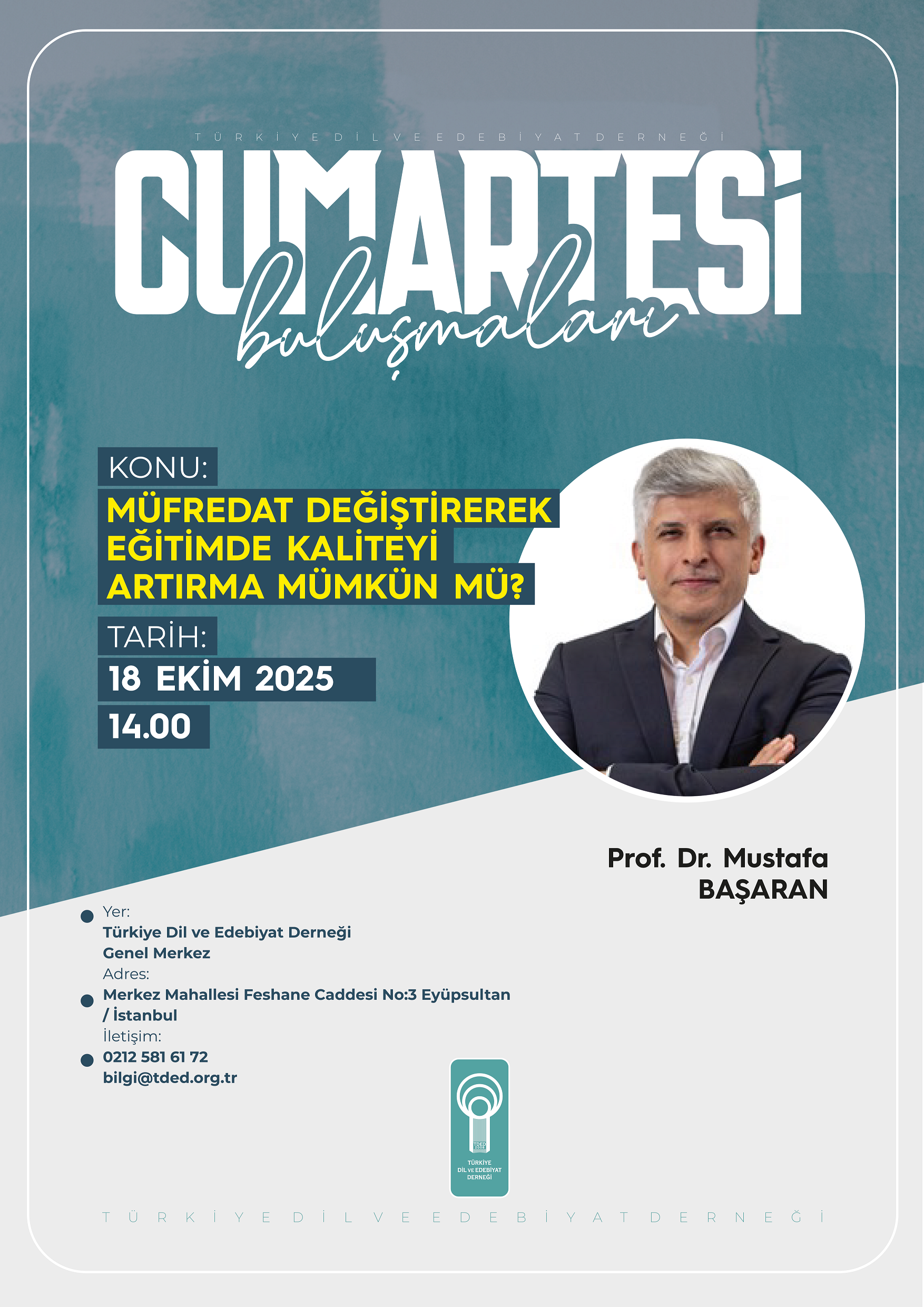 Türkiye Dil ve Edebiyat Derneğinin (TDED) haftalık söyleşi programı “Cumartesi Buluşmaları”nda Prof. Dr. Mustafa Başaran, “Müfredat Değiştirerek Eğitimde Kaliteyi Artırma Mümkün Mü?” başlıklı bir konuşma yapacak.