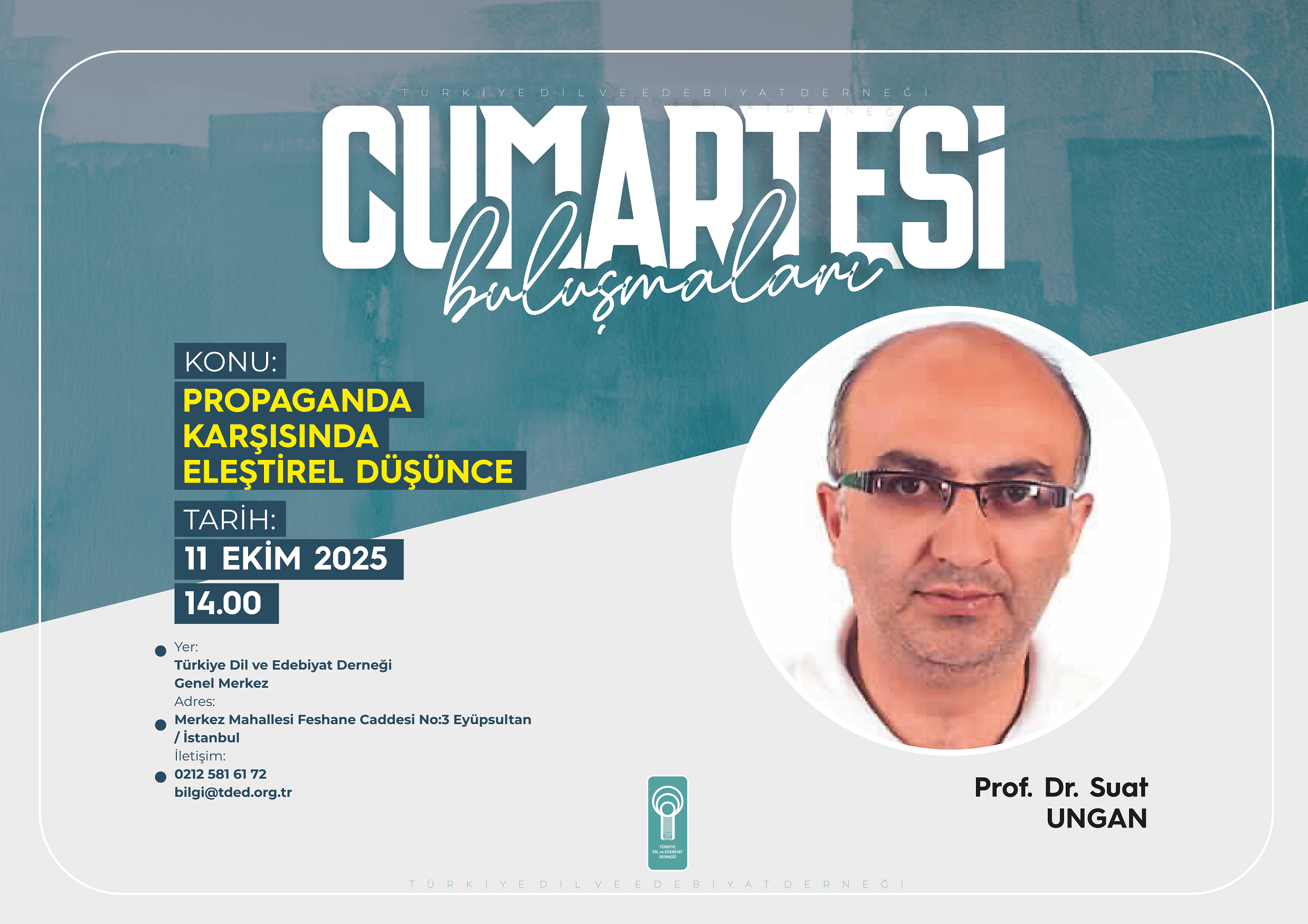 Türkiye Dil ve Edebiyat Derneğinin (TDED) haftalık söyleşi programı “Cumartesi Buluşmaları”nda Prof. Dr. Suat Ungan, “Propaganda Karşısında Eleştirel Düşünce” başlıklı bir konuşma yapacak.