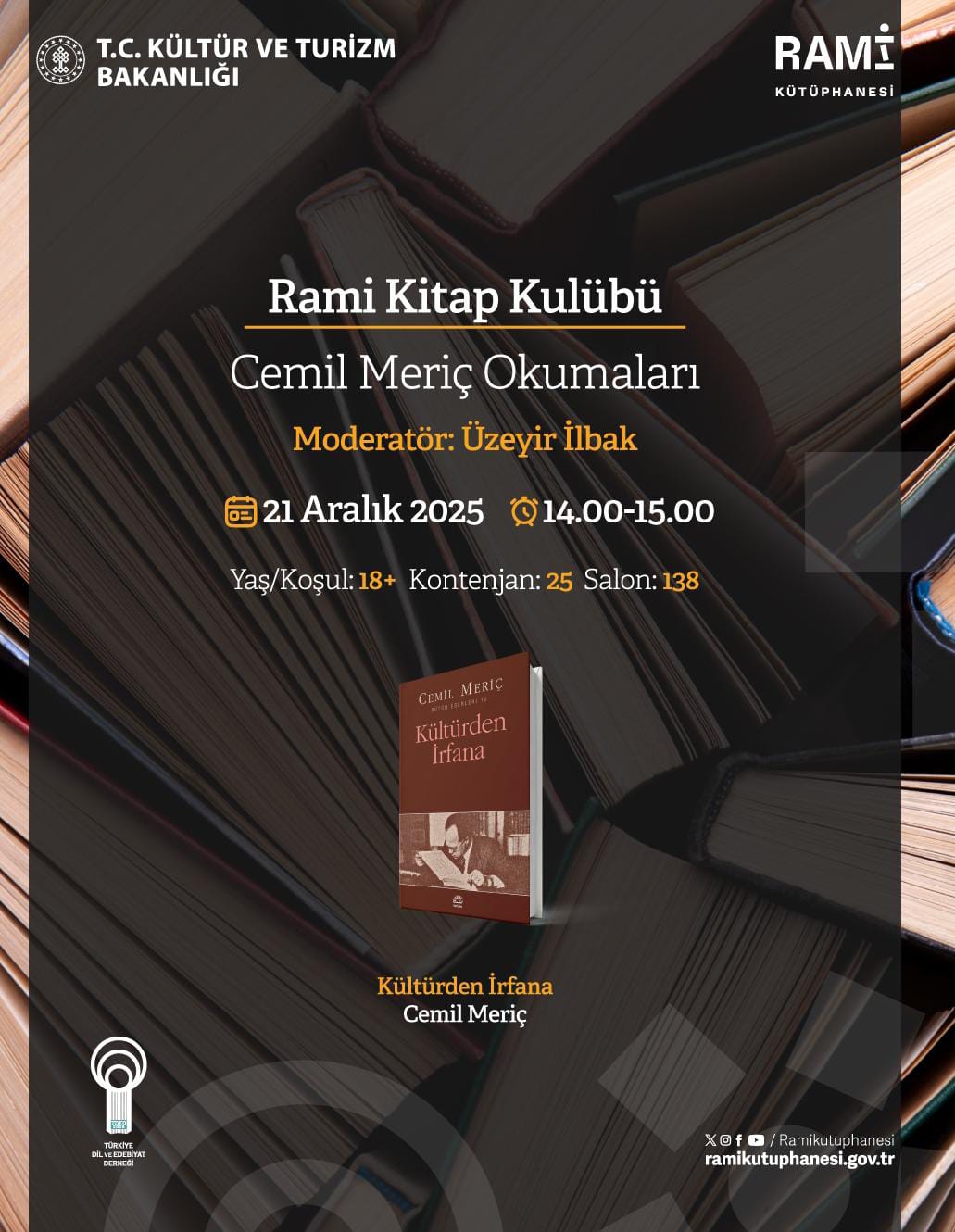 Kültür ve Turizm Bakanlığı, Rami Kütüphanesi ve Türkiye Dil ve Edebiyat Derneği iş birliği ile düzenlenen “Rami Kitap Kulübü: Cemil Meriç Okumaları” etkinlikleri devam ediyor.