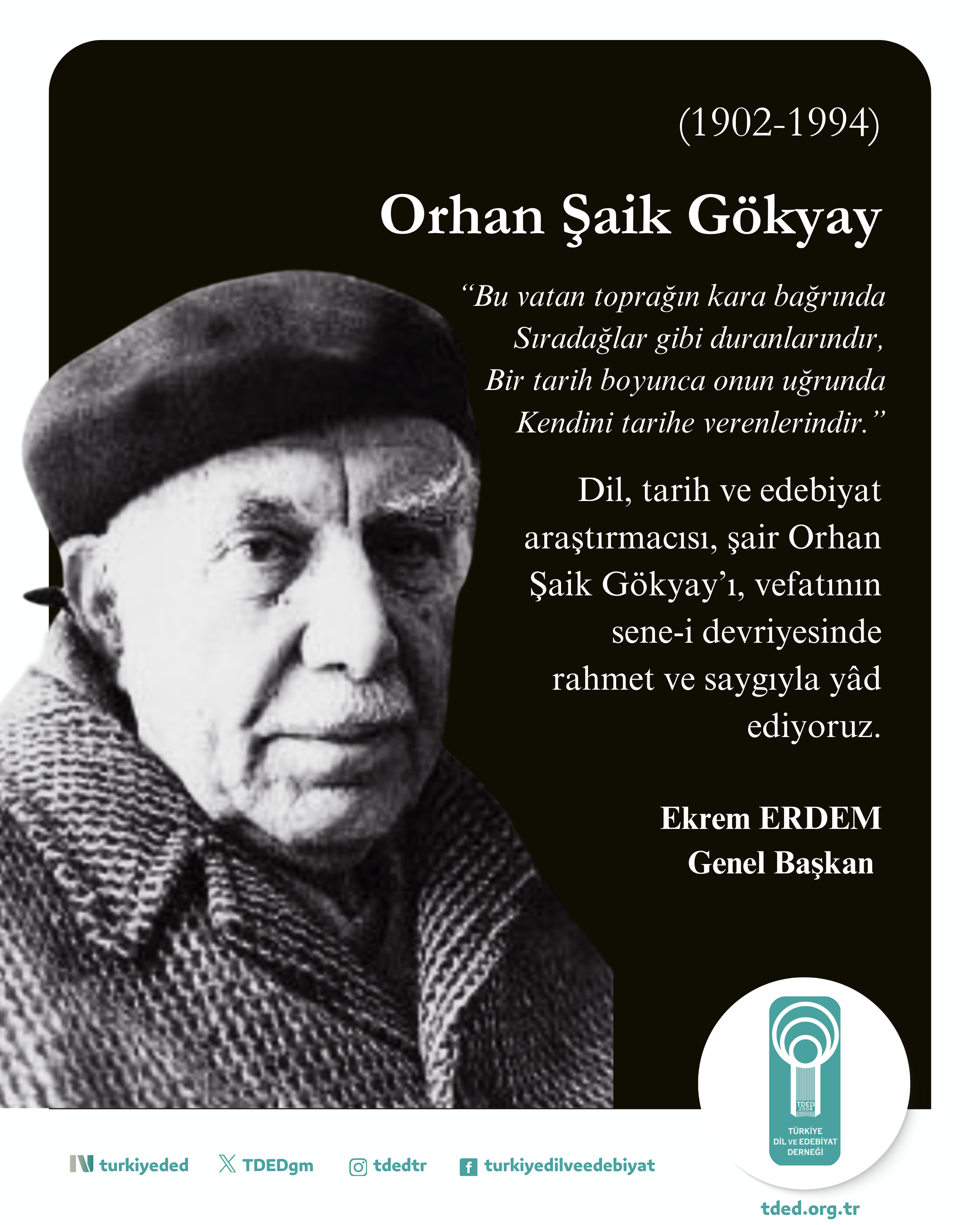 Dil, tarih ve edebiyat araştırmacısı, şair Orhan Şaik Gökyay’ı, vefatının sene-i devriyesinde rahmet ve saygıyla yâd ediyoruz.