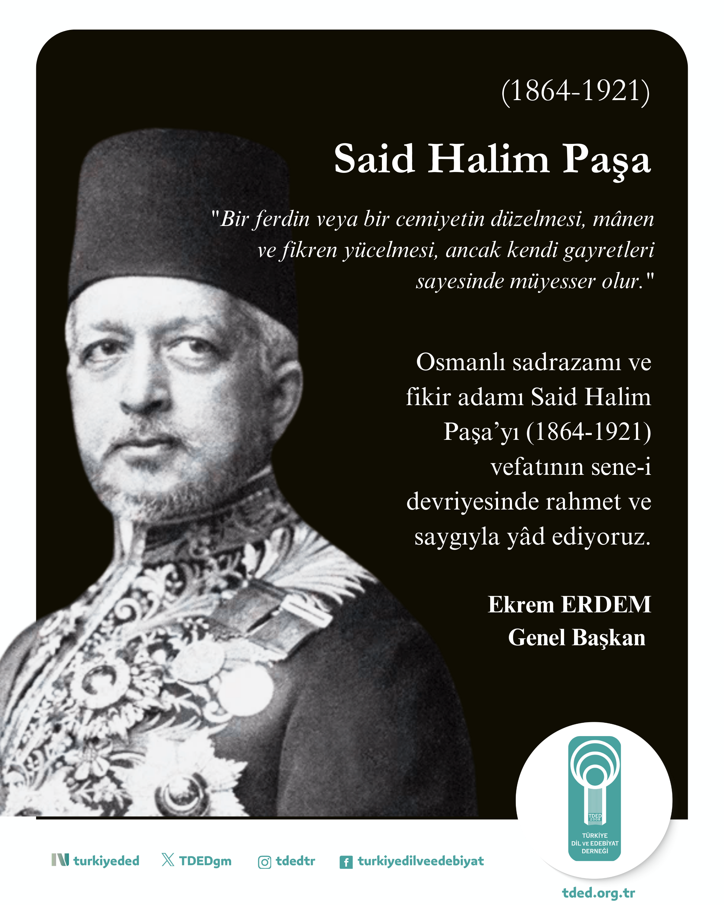 Osmanlı sadrazamı ve fikir adamı Said Halim Paşa’yı (1864-1921) vefatının sene-i devriyesinde rahmet ve saygıyla yâd ediyoruz.